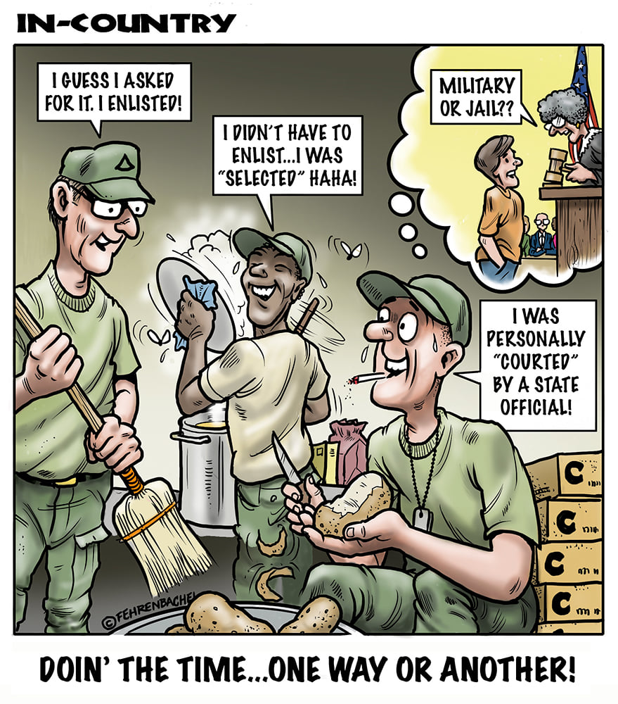 Phil enlisted in the Army in 1965 where he served for years in Vietnam. He became a graphic designer and has worked for the state of Oregon for 26 years. He retired in 2003 and started the Cartoon "In-Country". The cartoons reflect his experiences during his tour of duty in South Vietnam.